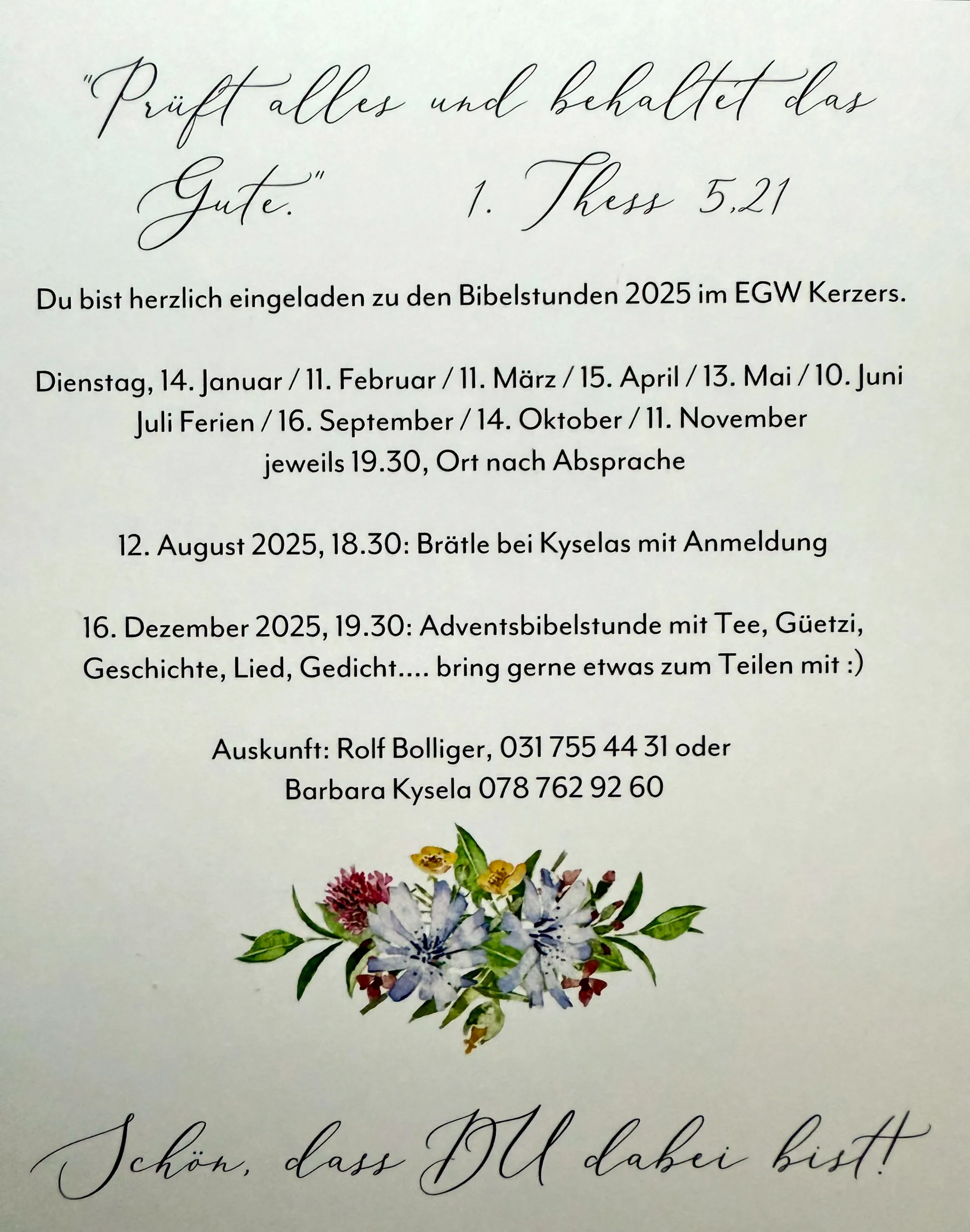 Die Bibelstunde findet einmal im Monat am Dienstagabend in Müntschemier statt. Die aktuellen Daten findest du in der Agenda.