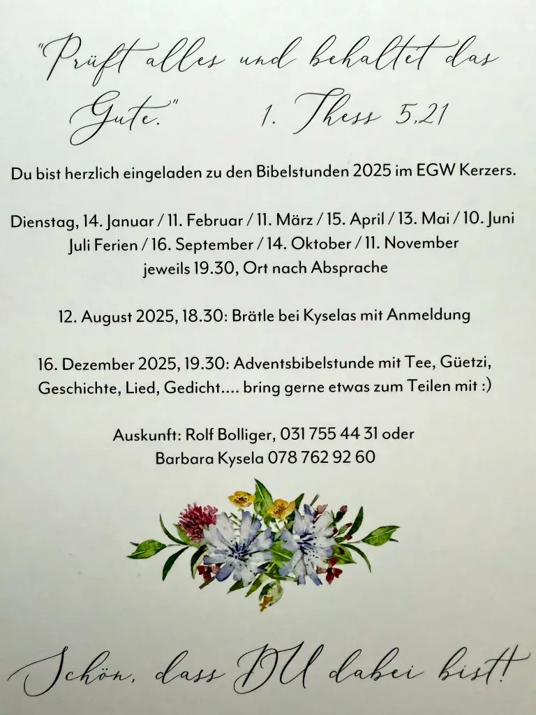 Die Bibelstunde findet einmal im Monat am Dienstagabend in Müntschemier statt. Die aktuellen Daten findest du in der Agenda.